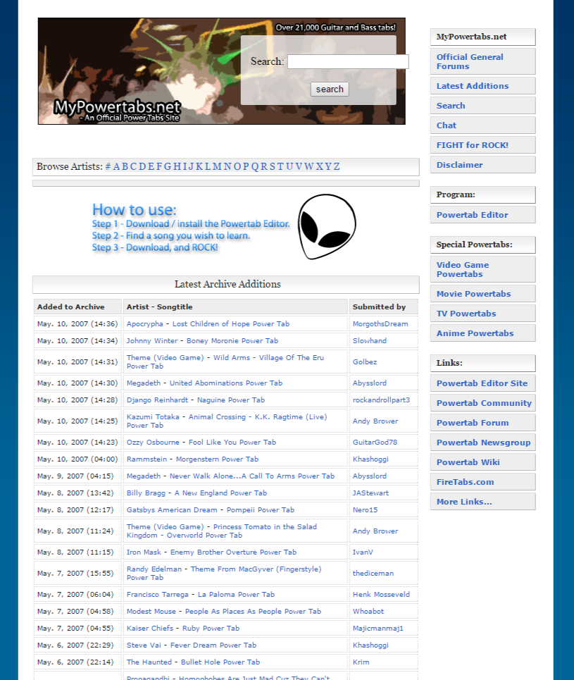 by community members and may not be 100% accurate. Most tabs are from sites dated pre-2007.